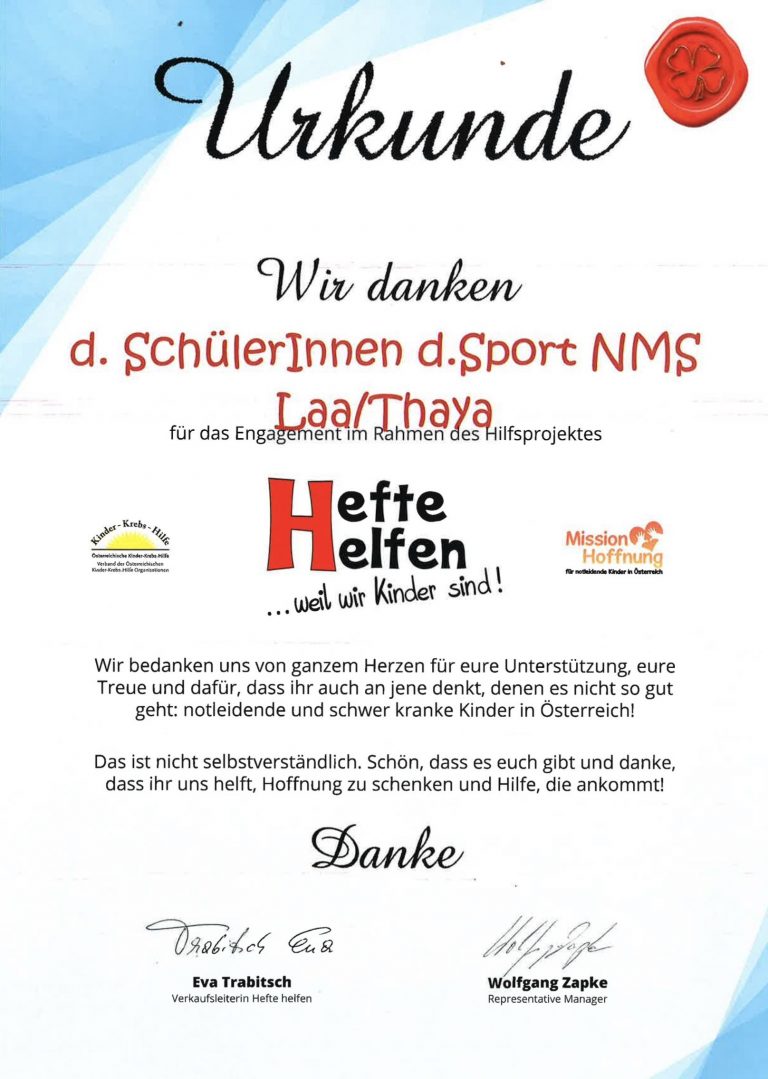 Pro Heft werden 5 Cent an die Kinderkrebshilfe gespendet, wofür sich „Hefte helfen“ bei unseren SchülerInnen recht herzlich bedankt.